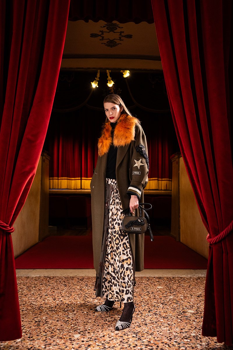 Abrigo largo en paño verde con detalles de estrellas y panteras en las mangas. Marca 5PROGRESS.