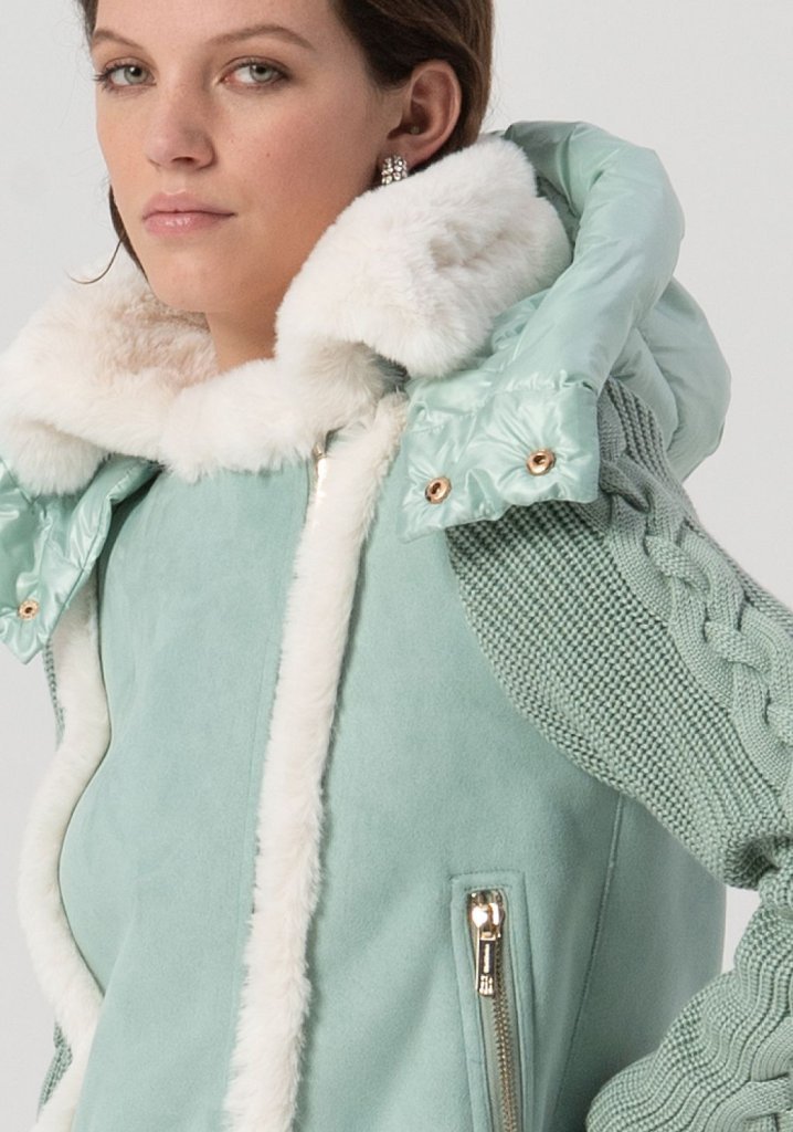Cazadora de tejido combinado. Mangas en punto acolchadas, cuerpo en ecopiel vuelta y capucha desmontable de tejido técnico. Largura intermedia. Marca Fracomina.
