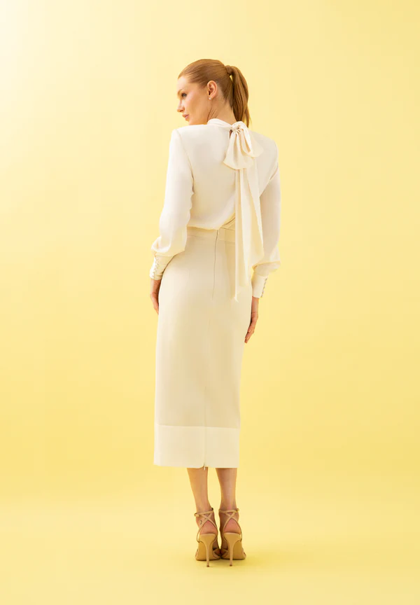 Conjunto de dos piezas compuesto por top de cuello subido, hombros marcados y lazada en la parte trasera. Manga larga y puños con botones forrados. Tejido satinado de líneas limpias y estructura refinada, que aporta una silueta estilizada y contemporánea. La falda de largo midi, con corte recto y caída fluida, equilibra el conjunto con sobriedad y sofisticación. Una propuesta atemporal y elegante, ideal para eventos especiales. Perfecto para comuniones o novias informales.