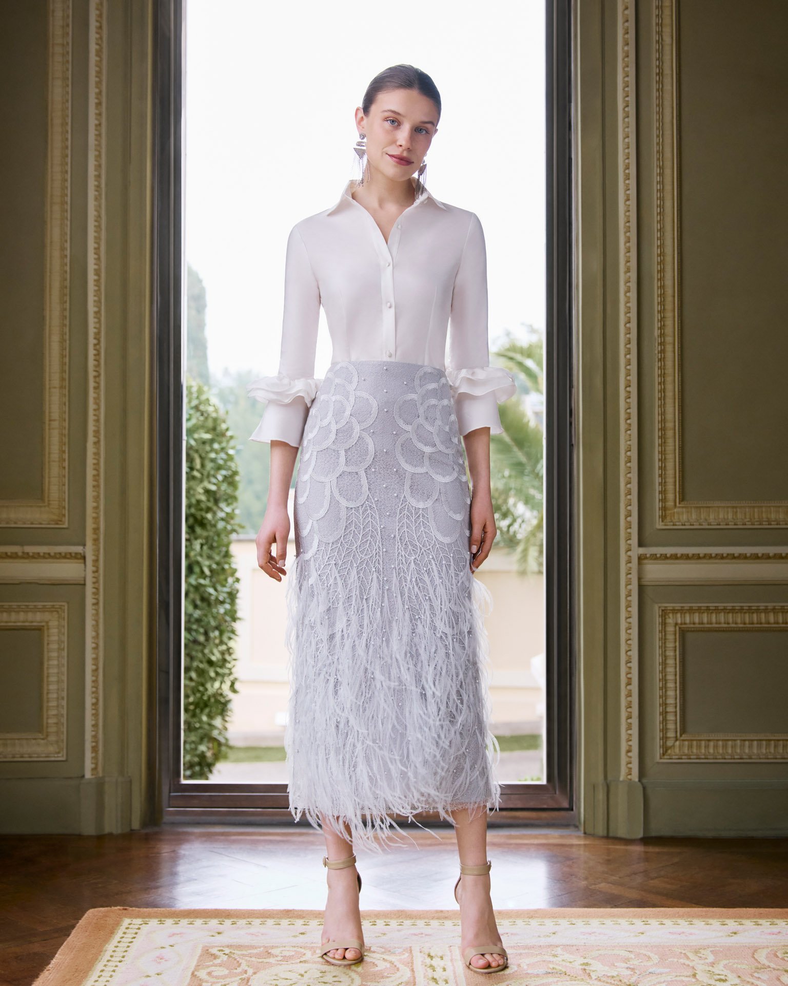 Blusa y falda de fiesta, dos piezas confeccionadas en malla bordada con blusa en tafetán. Con cuello camisero, manga francesa, espalda cerrada y plumas.