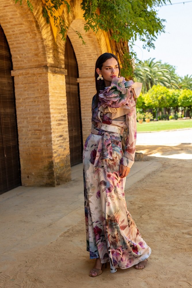 Este conjunto elegante y sofisticado está compuesto por una blusa de manga larga con delicados detalles florales en tonos pastel, que se combinan perfectamente con la falda de corte fluido. La blusa, con tejido texturizado, ofrece un toque de sofisticación, mientras que la falda, con el mismo estampado, presenta una caída suave que resalta la figura.