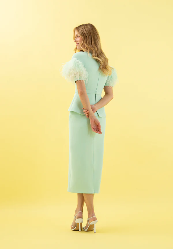 Vestido midi confeccionado en crepé de alta calidad, con una silueta recta que estiliza la figura. Destaca por sus mangas cortas adornadas con delicadas plumas, que aportan un toque sofisticado y distintivo. El diseño se completa con un sutil detalle peplum en la cintura, realzando la feminidad del conjunto. Una pieza refinada y atemporal, ideal para eventos especiales y ocasiones elegantes.