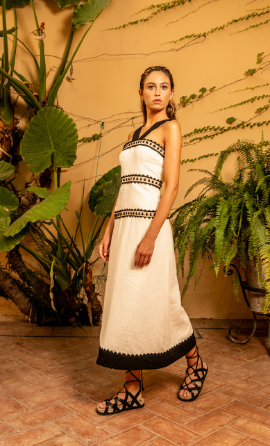 Vestido bicolor con pasamanería.