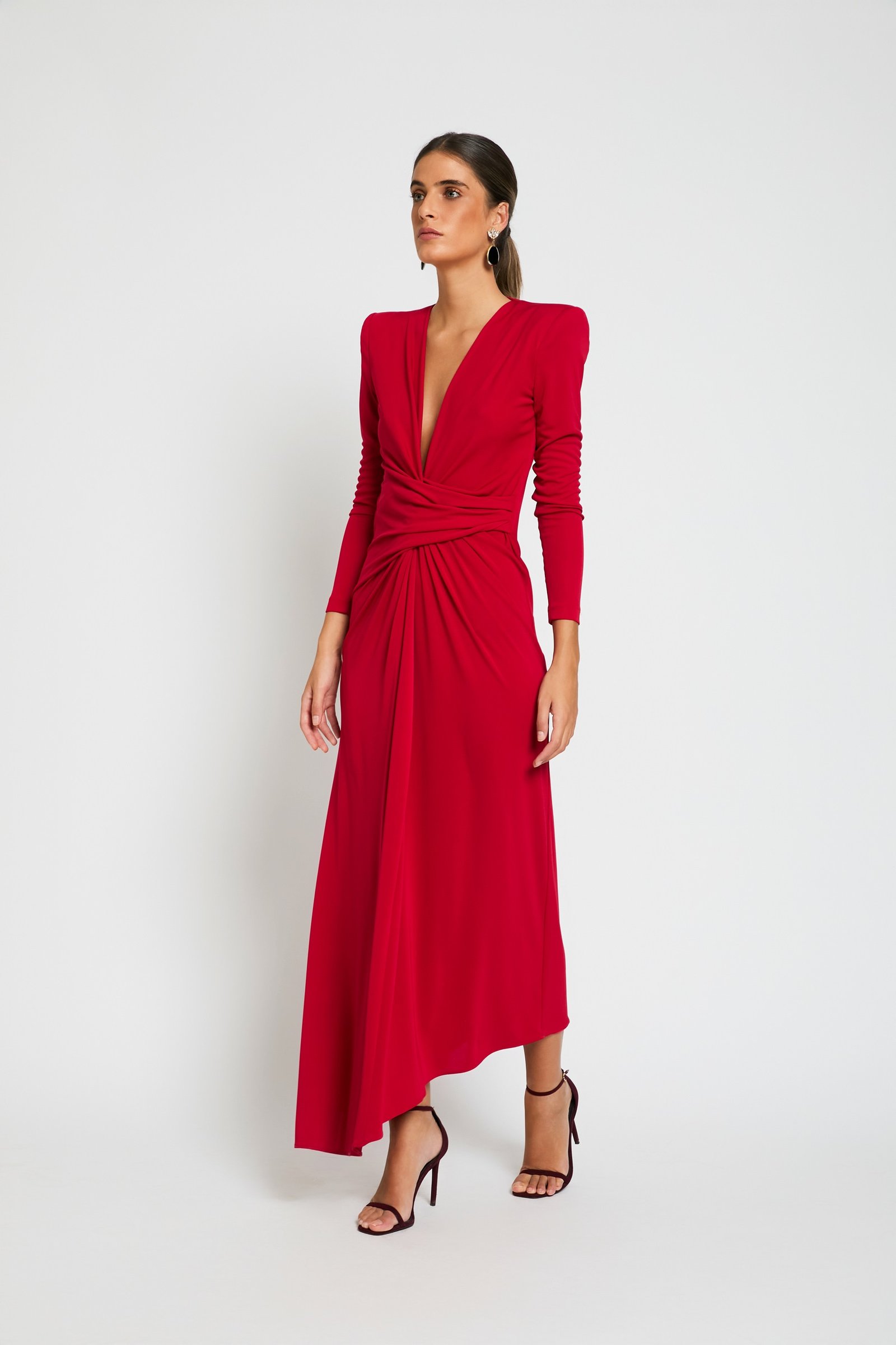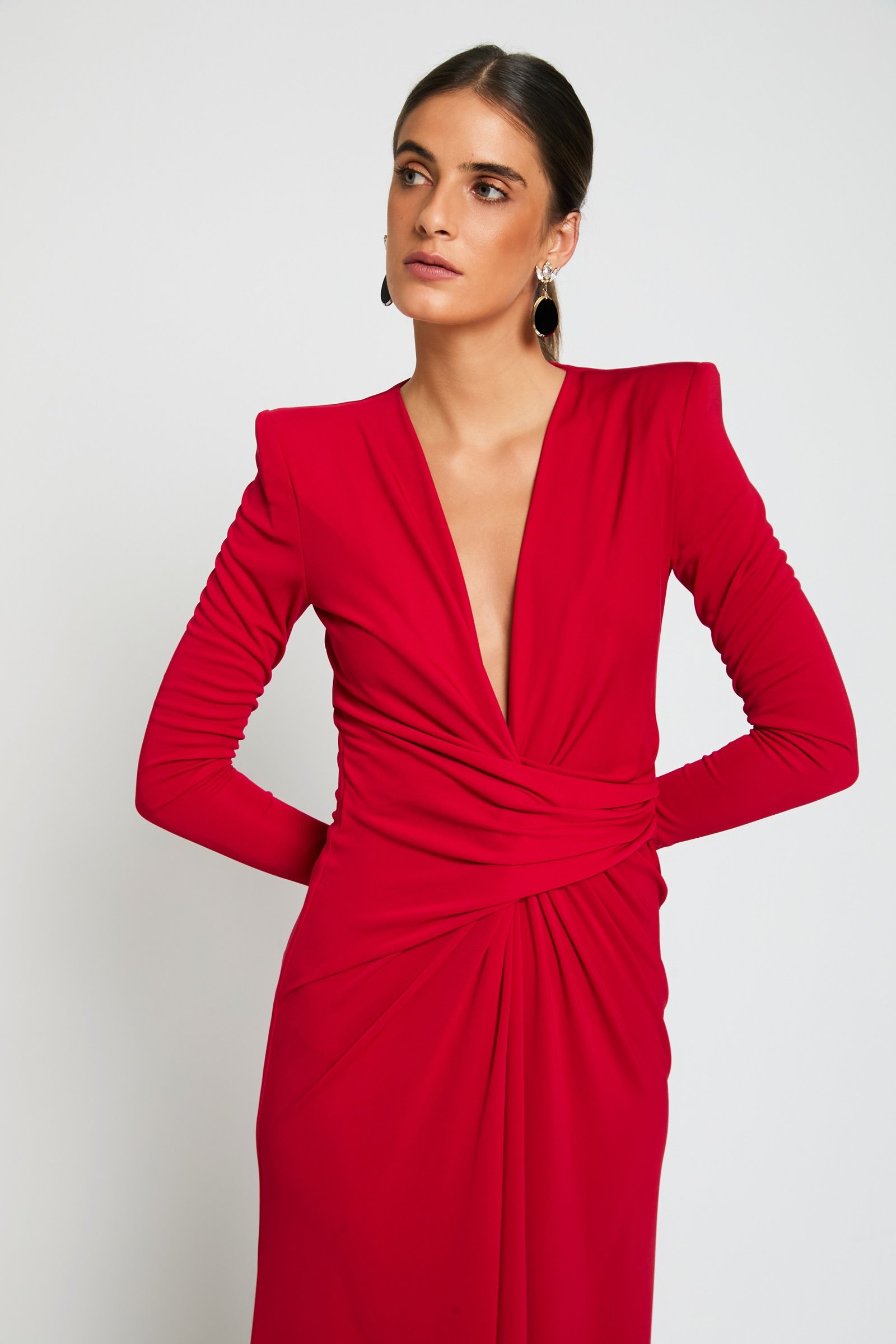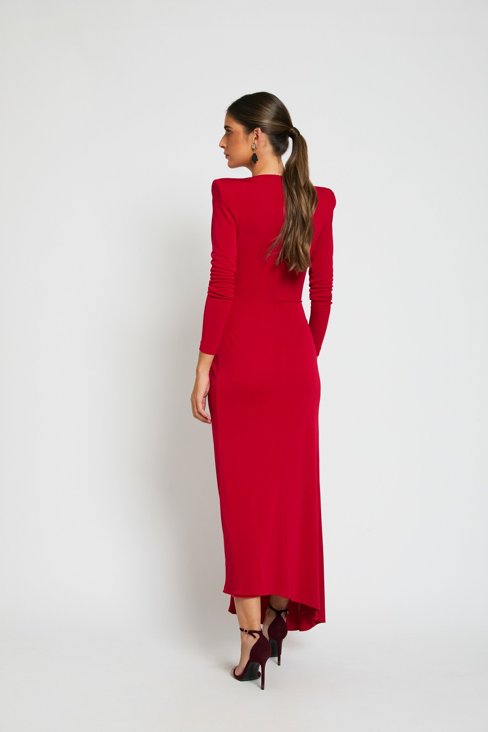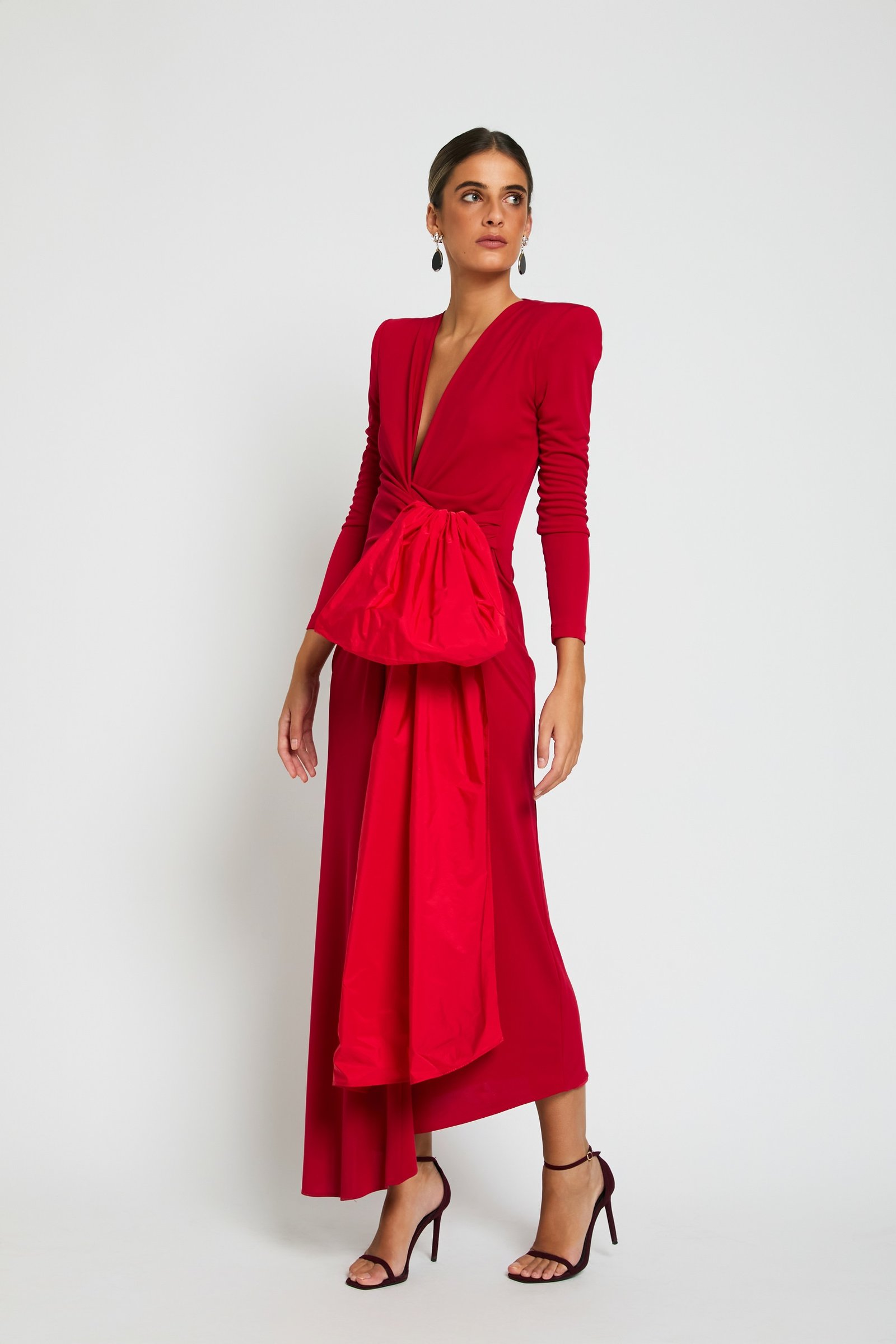 Vestido midi de líneas sofisticadas y gran fuerza estética. Diseño de manga larga con escote en pico profundo y detalle de lazada desmontable en la cintura, que aporta volumen y un punto artístico al conjunto. Su falda fluida y asimétrica estiliza la silueta y acompaña el movimiento con una caída elegante. Versátil y refinado, ideal para eventos especiales, celebraciones o looks de invitada con carácter y distinción.