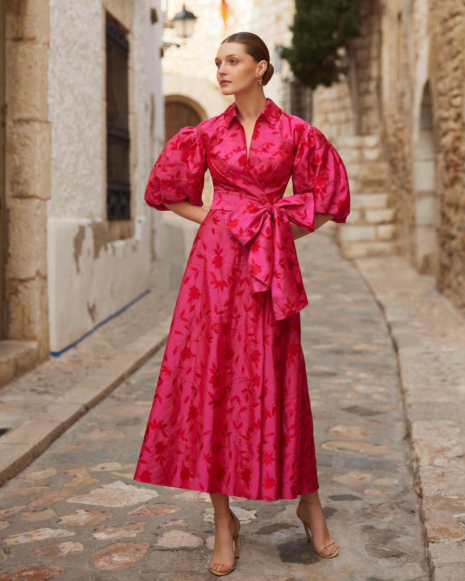 Vestido de fiesta midi y estilo clásico. Confeccionado en tafetán bordado. Con escote camisero, manga abullonada y cinturón de tafetán