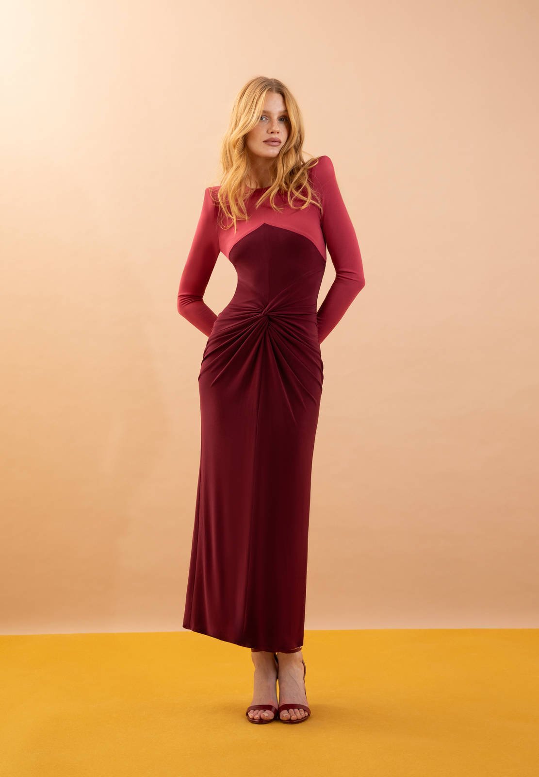Vestido de punto bicolor con escote a la caja, hombros marcados y manga larga. Cortes en el cuerpo y falda donde anuda en el centro y drapea hacia los costados.