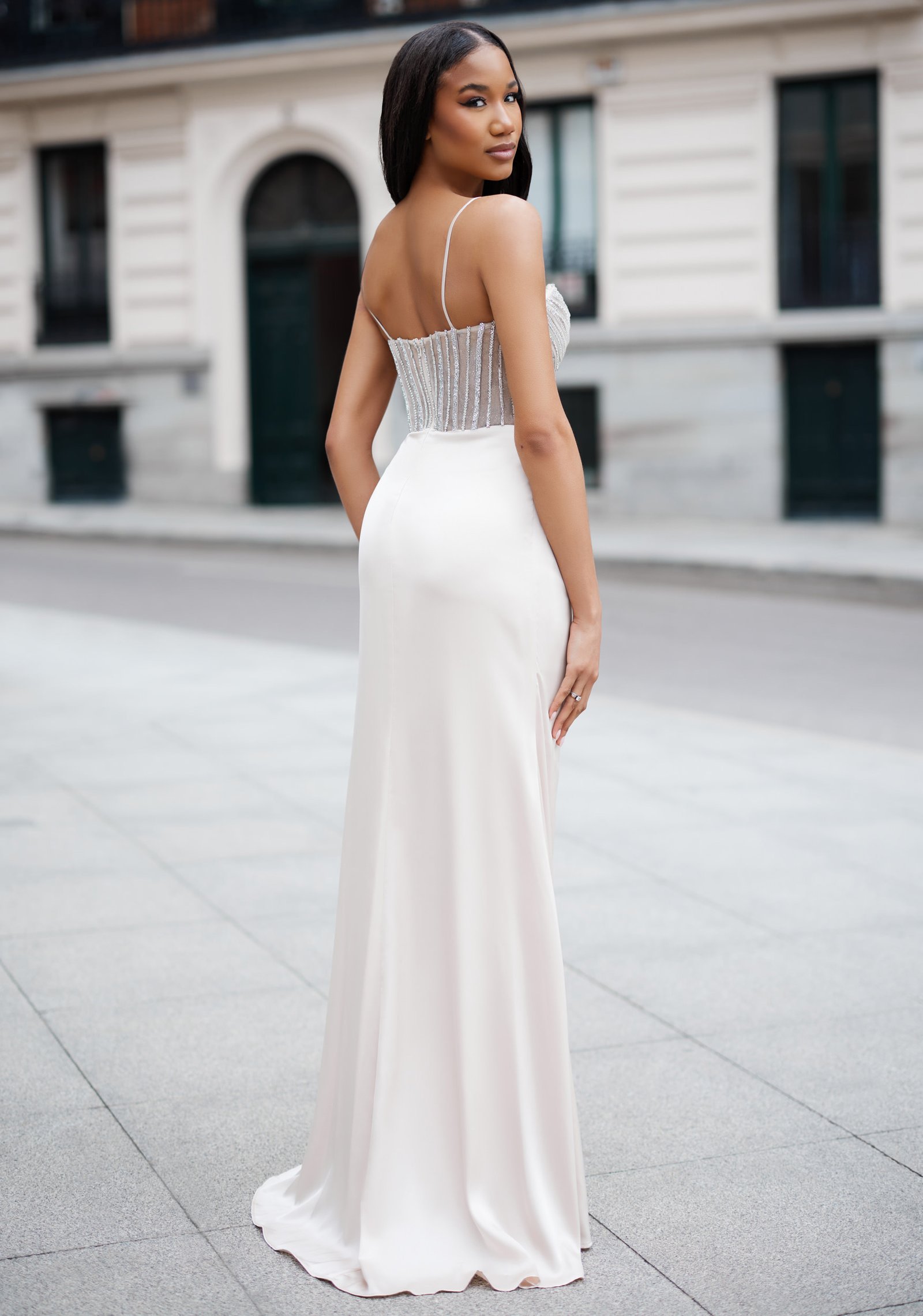 Vestido de noche en color champagne con corpiño semitransparente bordado en pedrería.