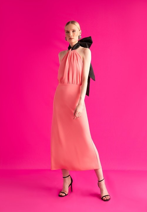 Vestido midi en crepé anudado al cuello en tafeta con una lazada en la parte trasera. Cuerpo ablusado con corte en la cintura y falda con un ligero evasé.