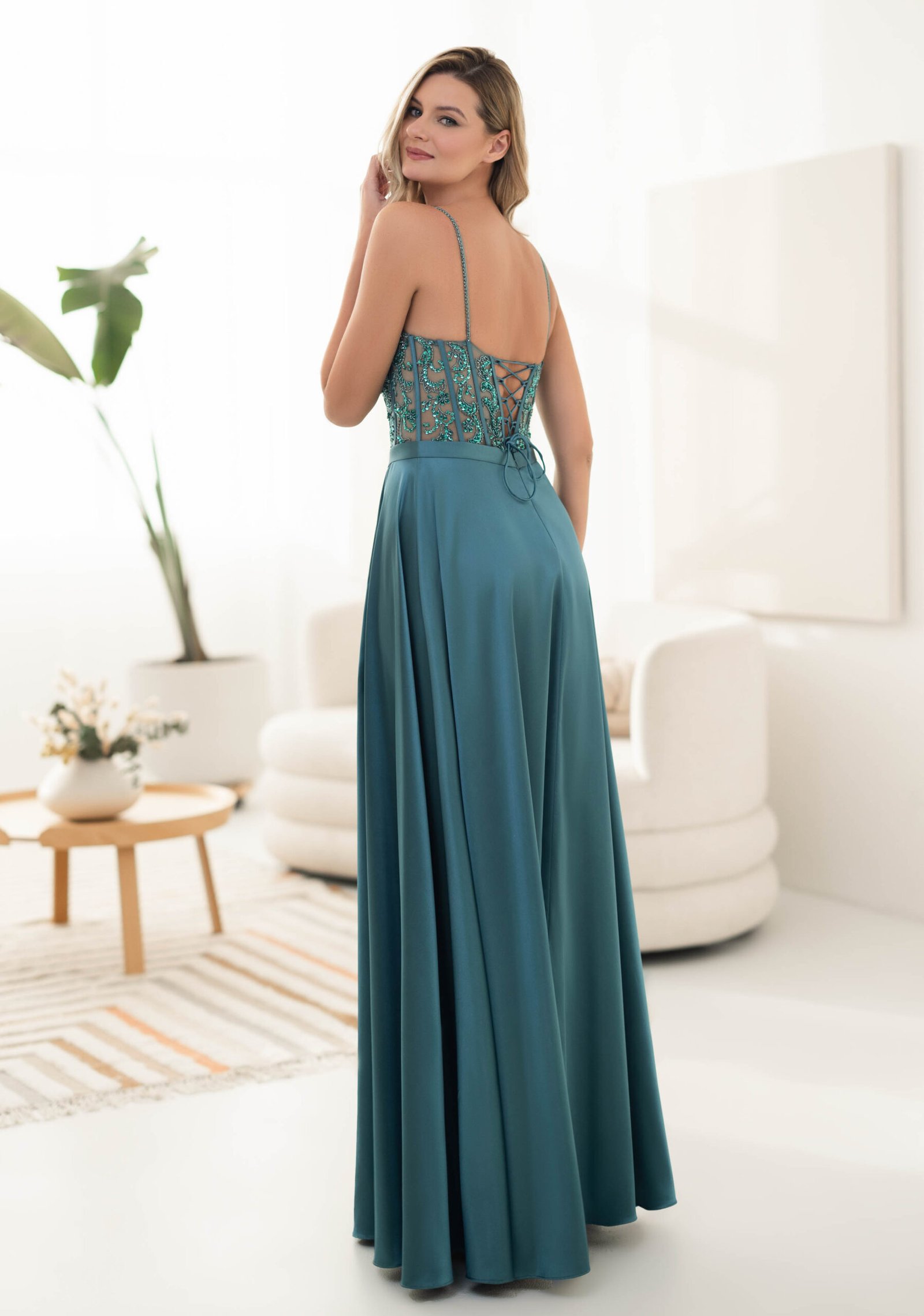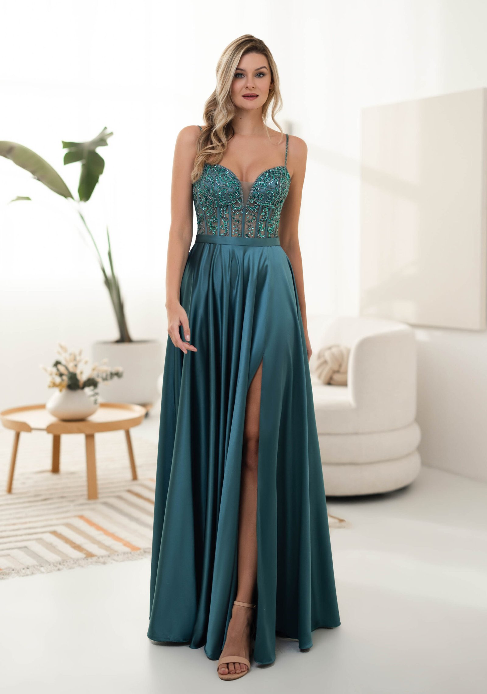 Vestido de noche de satén verde con corpiño de pedrería semitransparente.