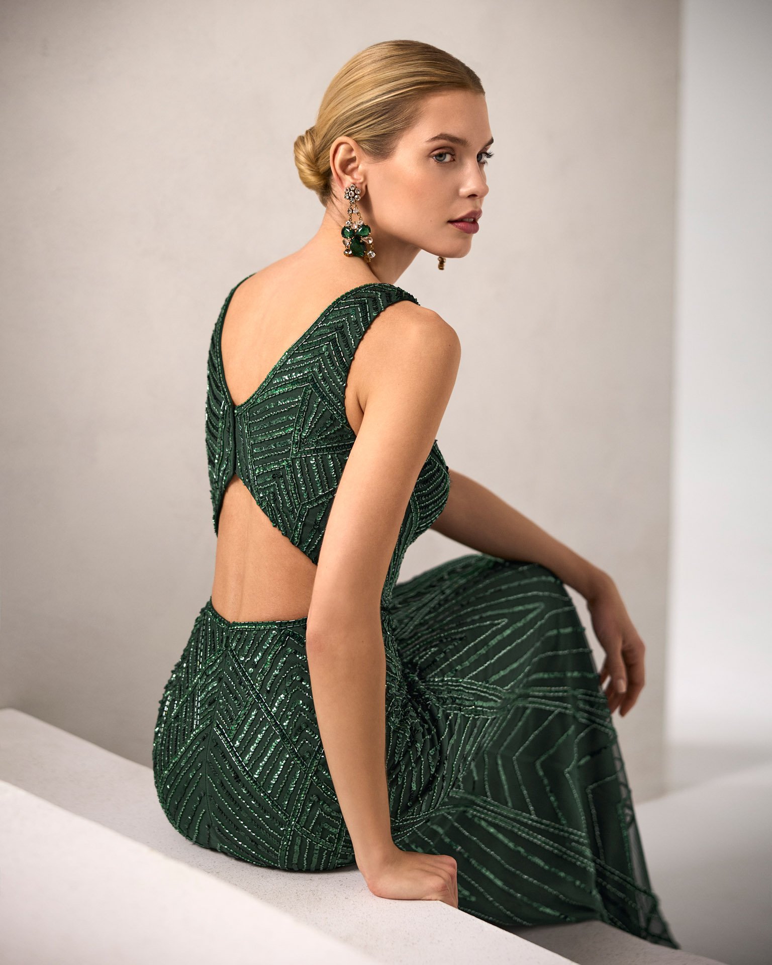 Vestido de fiesta largo. Confeccionado en pedrería. Escote pico, tirantes y espalda con abertura. Incluye capa.