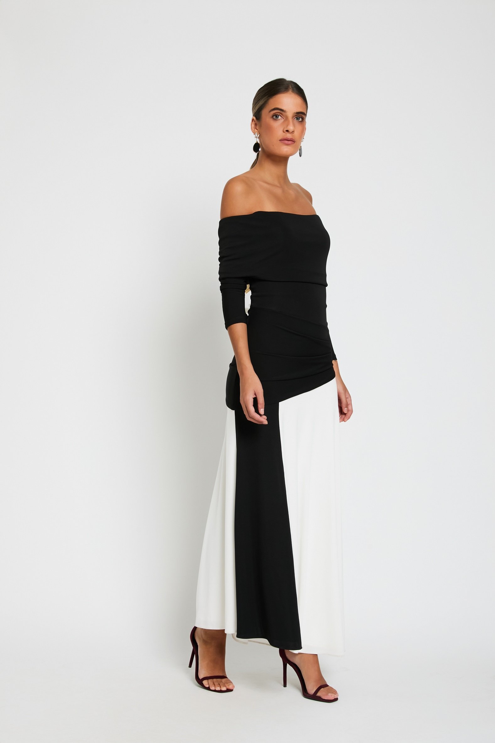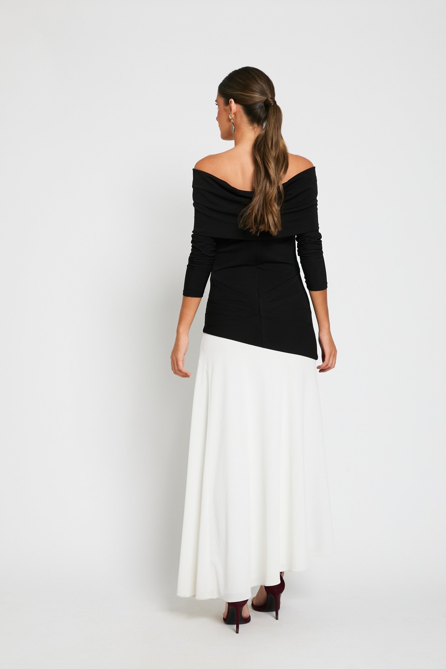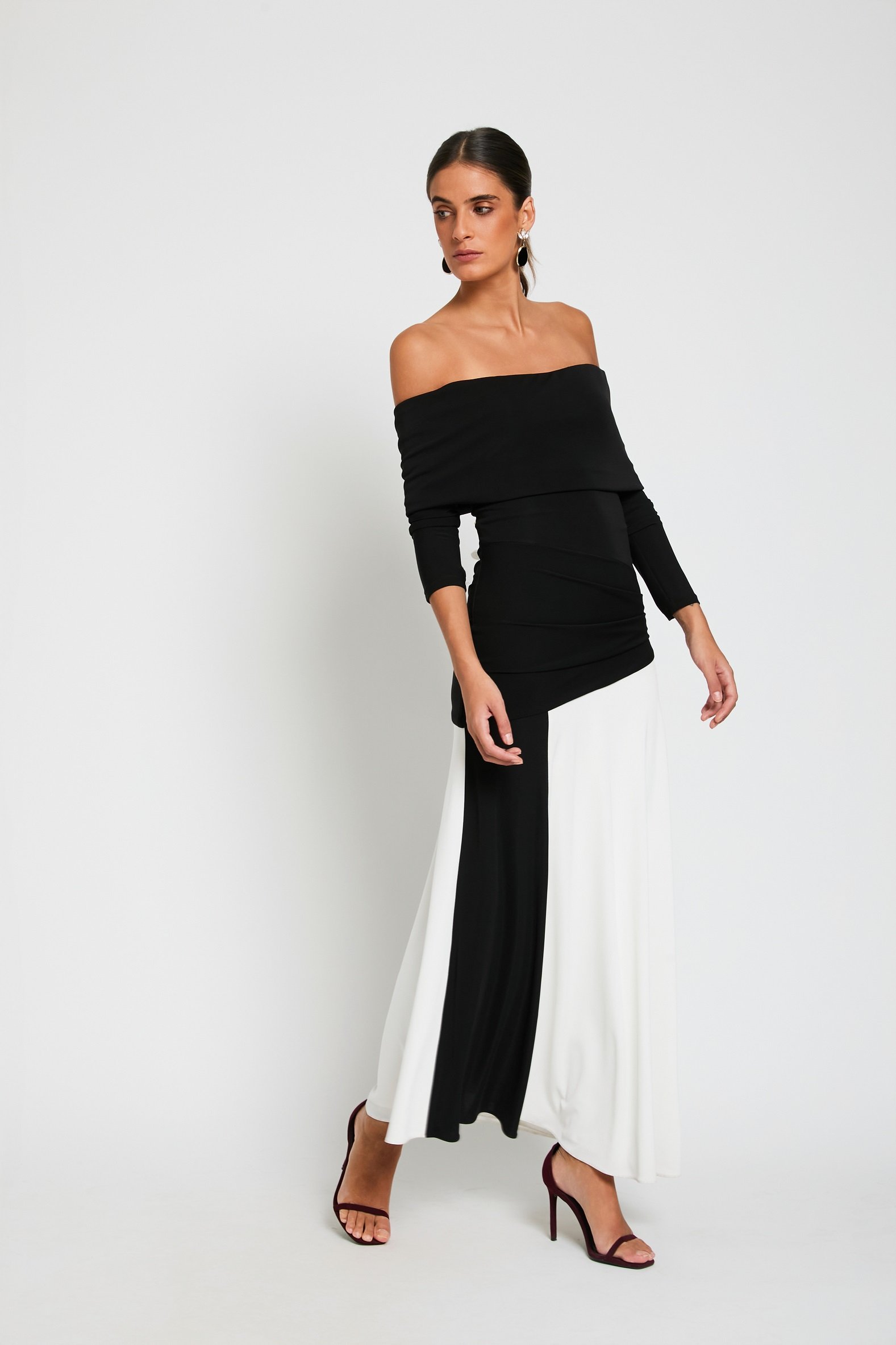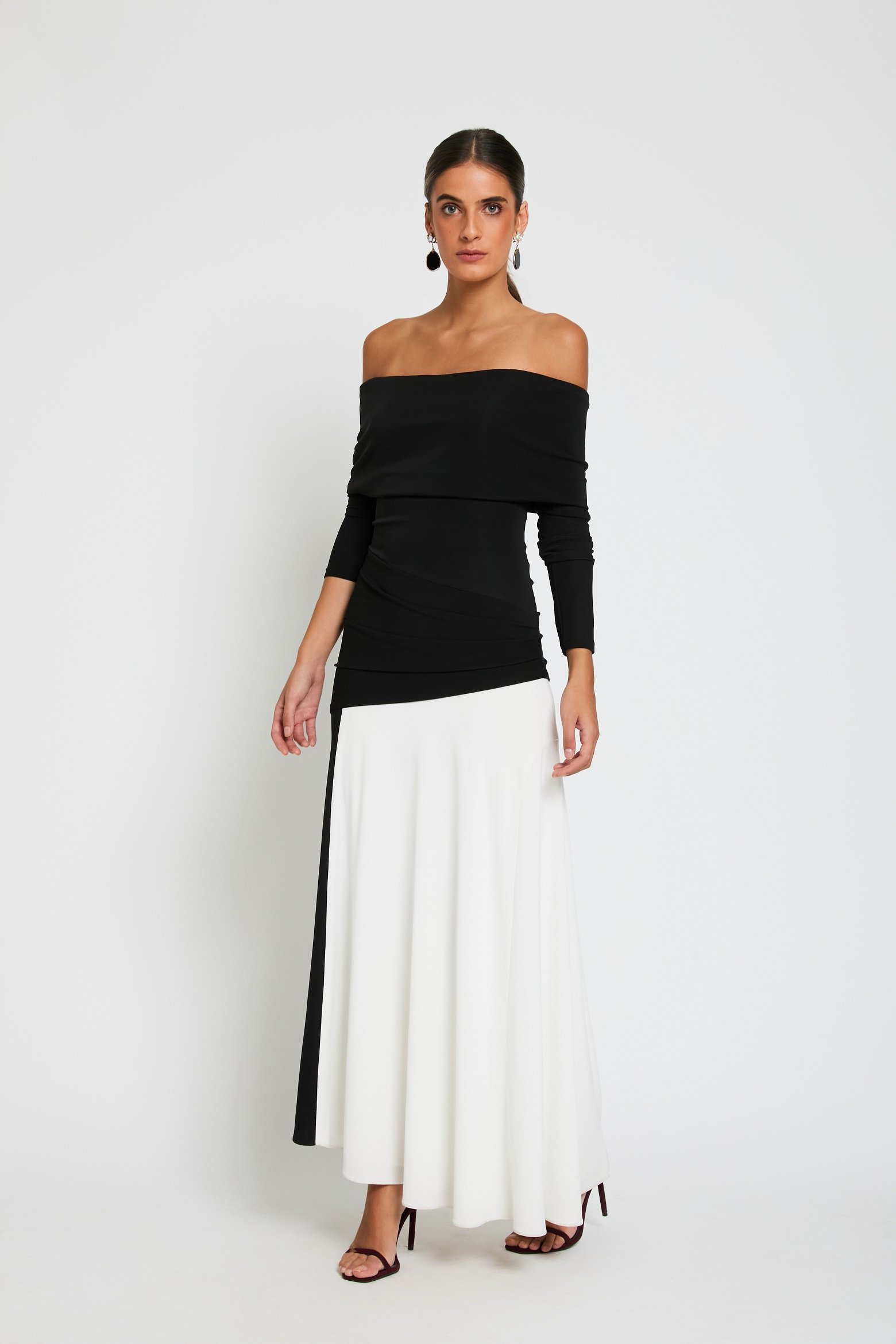 Vestido de corte sofisticado con escote palabra de honor y mangas ajustadas al brazo, que realzan la silueta con elegancia. Su diseño estiliza la figura gracias al cuerpo entallado y a la falda fluida de caída suave con efecto asimétrico. Una pieza refinada y atemporal, ideal para eventos especiales o ocasiones donde destacar con discreta distinción. Disponible en marino.