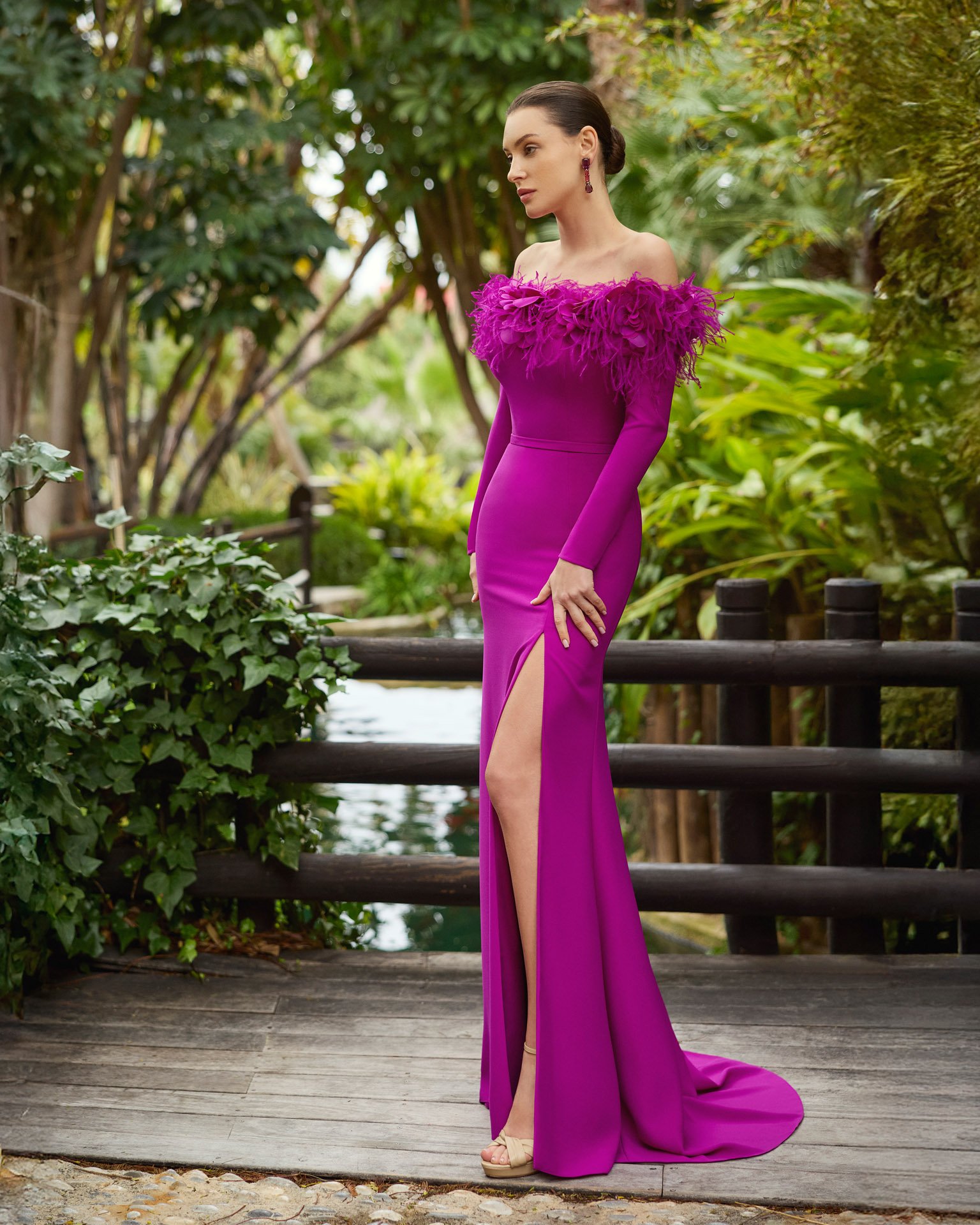 Vestido de fiesta largo confeccionado en crepé. Escote bajo hombro con plumas y flores 3D. Manga larga y abertura en el lateral de la falda.