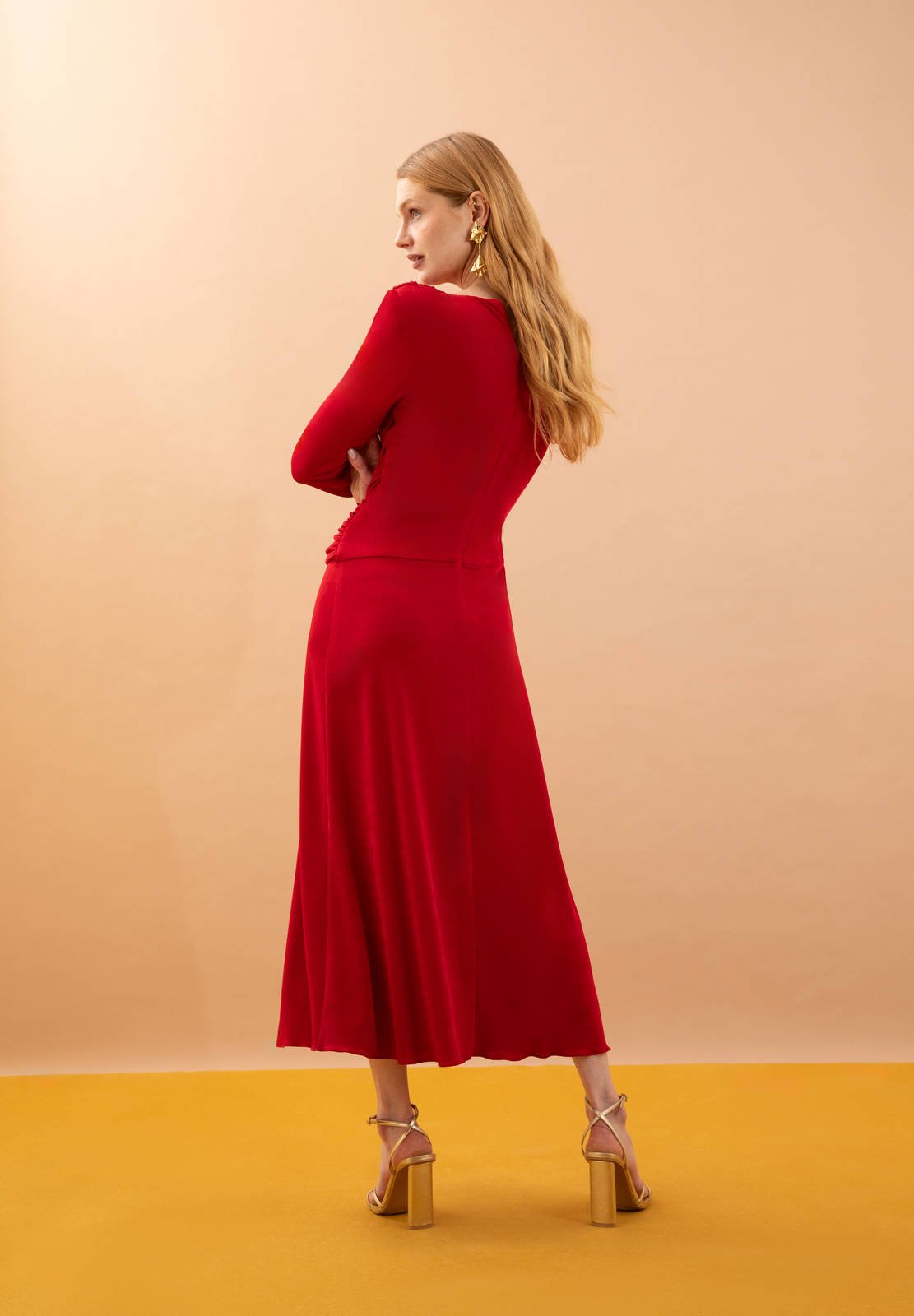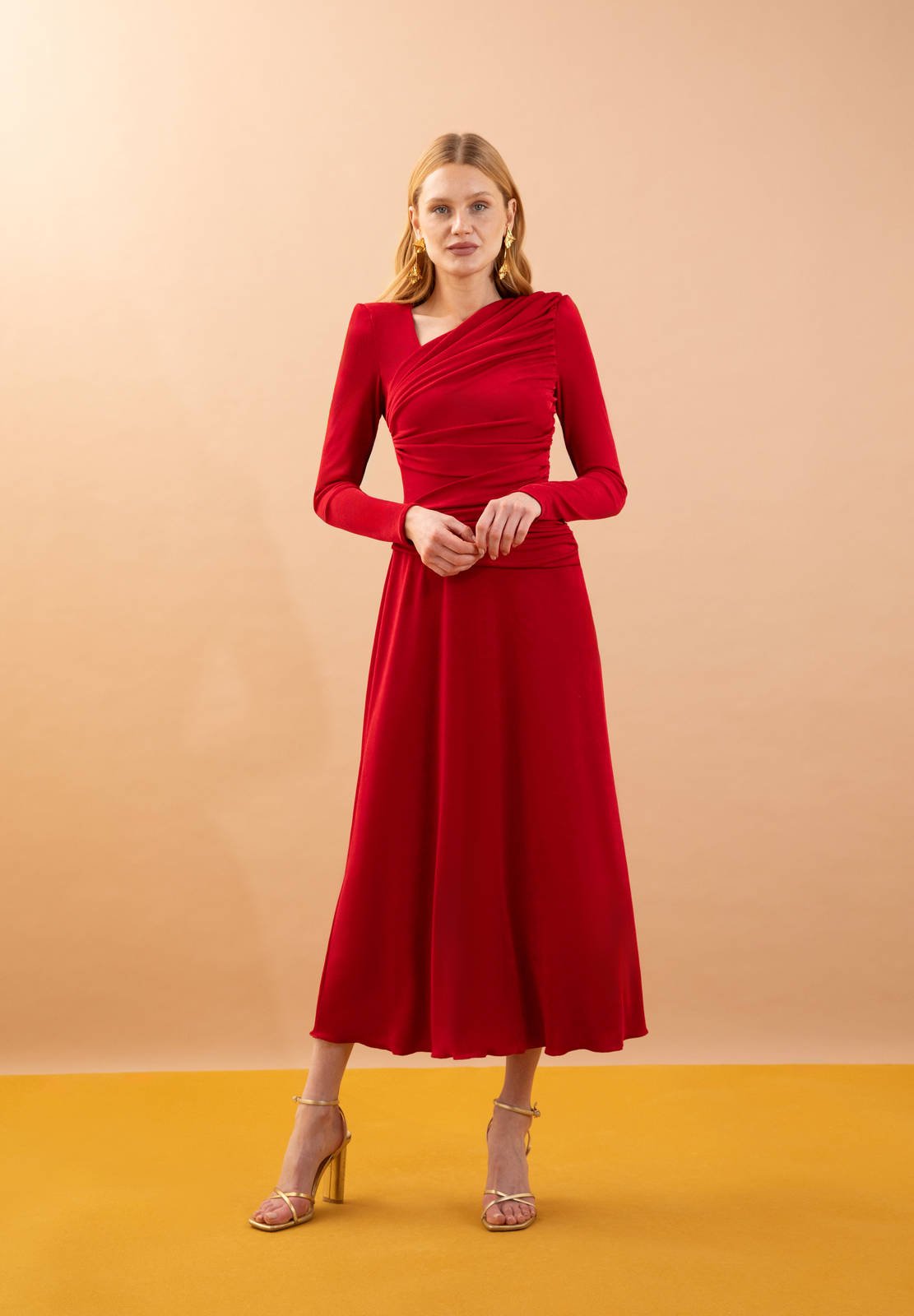 Vestido de punto con manga larga. Cuerpo drapeado dejando el escote asimétrico. Falda de capa.