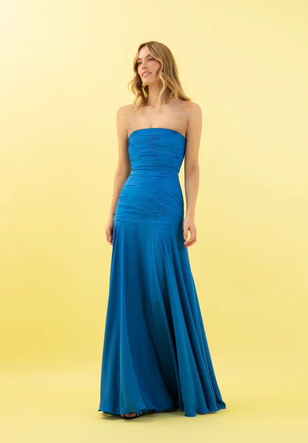 Este deslumbrante diseño es la definición de la sofisticación atemporal. Destaca por su cuerpo palabra de honor meticulosamente plisado de forma horizontal, que ciñe y esculpe la silueta con un acabado artesanal. La falda, de talle bajo y caída fluida, aporta un movimiento ligero y majestuoso al caminar. Una pieza minimalista de alto impacto, diseñada para invitadas que buscan protagonismo a través de una elegancia pura y un color lleno de fuerza.