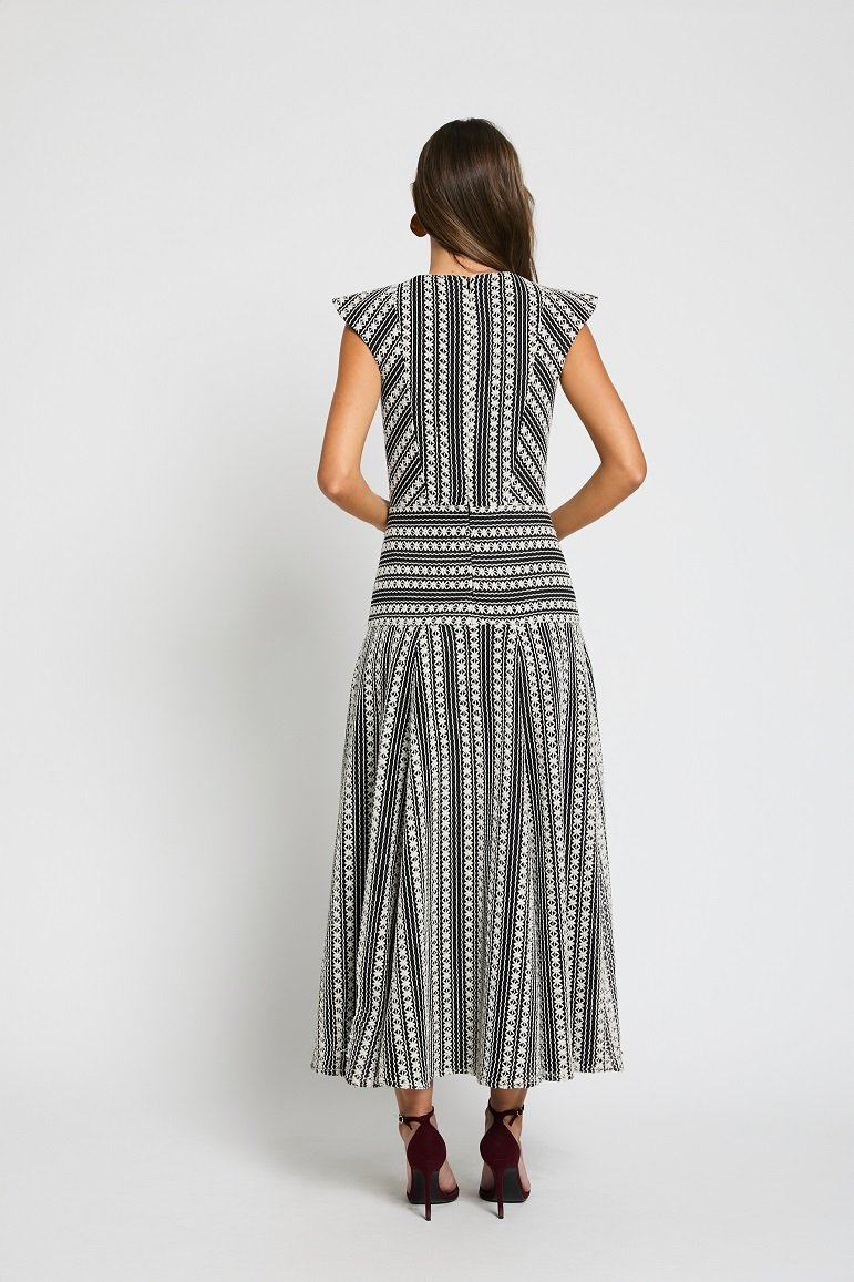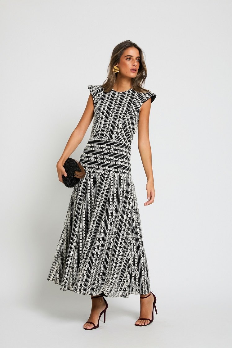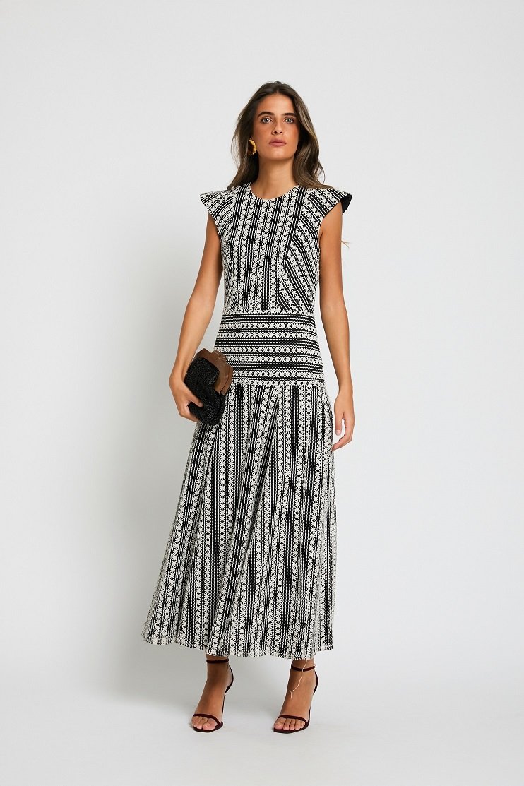 Vestido midi en blanco y negro con tejido geométrico con relieve que aporta carácter y elegancia. Diseño sin mangas con hombros estructurados, cintura definida y falda de caída fluida. Una prenda sofisticada y atemporal, ideal para eventos o looks de invitada con estilo. Disponible con fondo crudo.