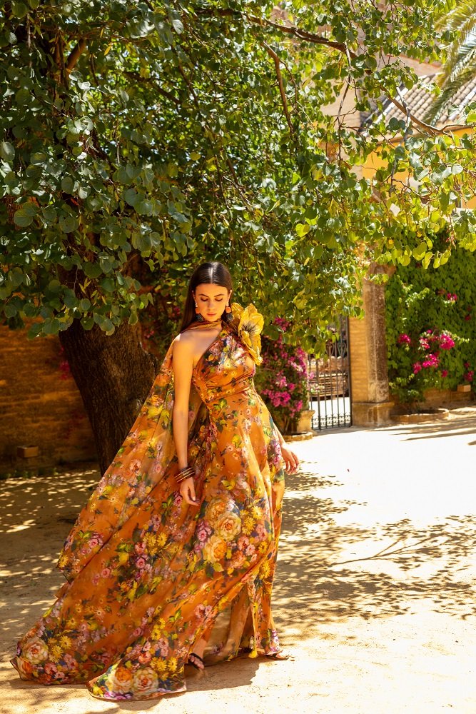 Este impresionante vestido largo en tonos cálidos de mostaza, con un hermoso estampado floral, ofrece un look elegante y vibrante. La falda con abertura lateral y el suave vuelo del tejido, junto con la capa que fluye delicadamente, hacen de este vestido una opción perfecta para ocasiones especiales, brindando un aire de sofisticación y frescura.