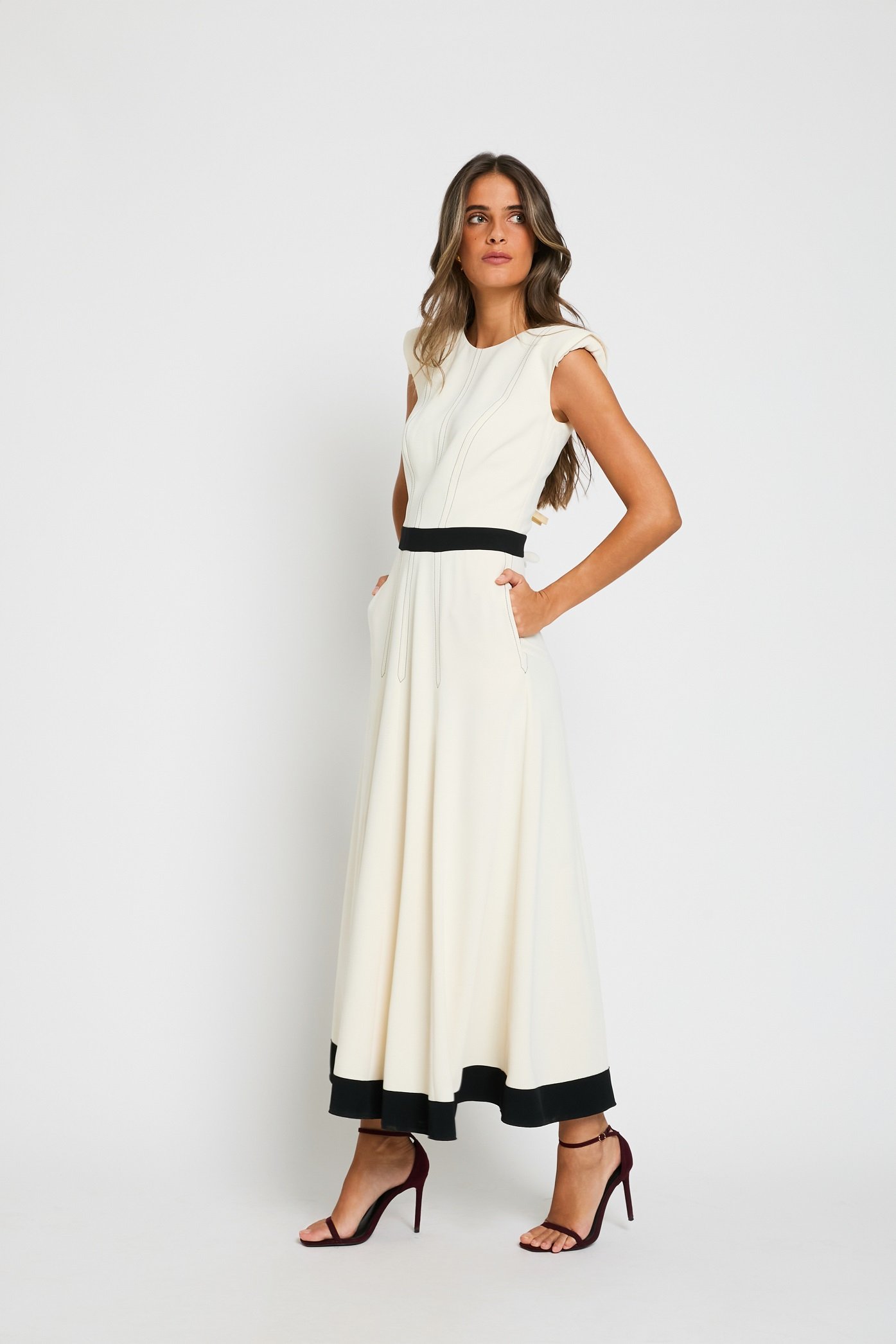 Vestido midi en tono marfil con detalles en contraste negro que realzan la silueta. Diseño sin mangas, cuello redondo y corte fluido, con cinturilla marcada y bajo con acabado en contraste. Elegante y sofisticado, ideal para eventos especiales o looks de invitada.