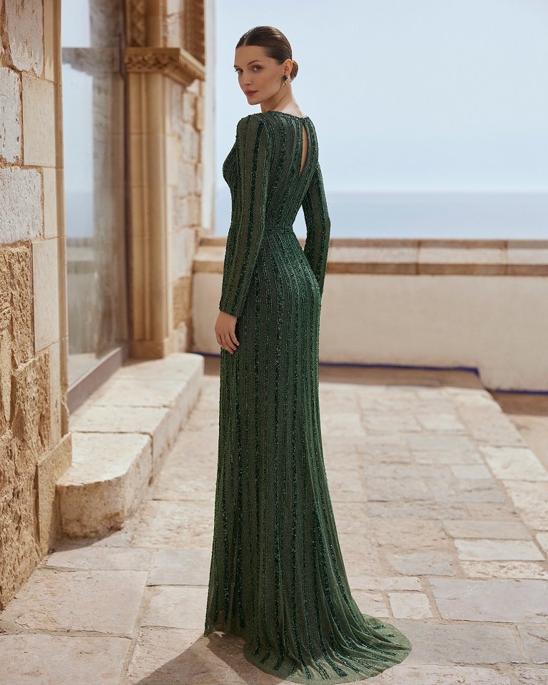 Vestido de fiesta largo y estilo elegante. Realizado en pedrería enriquecida con lentejuela. Con escote v, espalda lágrima, manga larga, y Falda con abertura lateral.